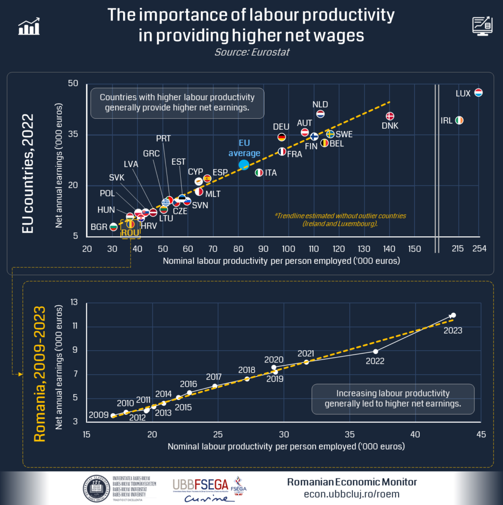 Data and economic theory suggest that sustainable long-term real wage growth is possible only if labor productivity increases simultaneously. In Europe, countries with higher per capita added value can afford to pay higher wages. However, this relationship isn’t always linear. In 2022, Romania’s average net wages were below the trend line, indicating that incomes were lower than expected given productivity gains. Possible explanations include the prevalence of the gray economy and higher dividends to owners and investors rather than wages to workers.