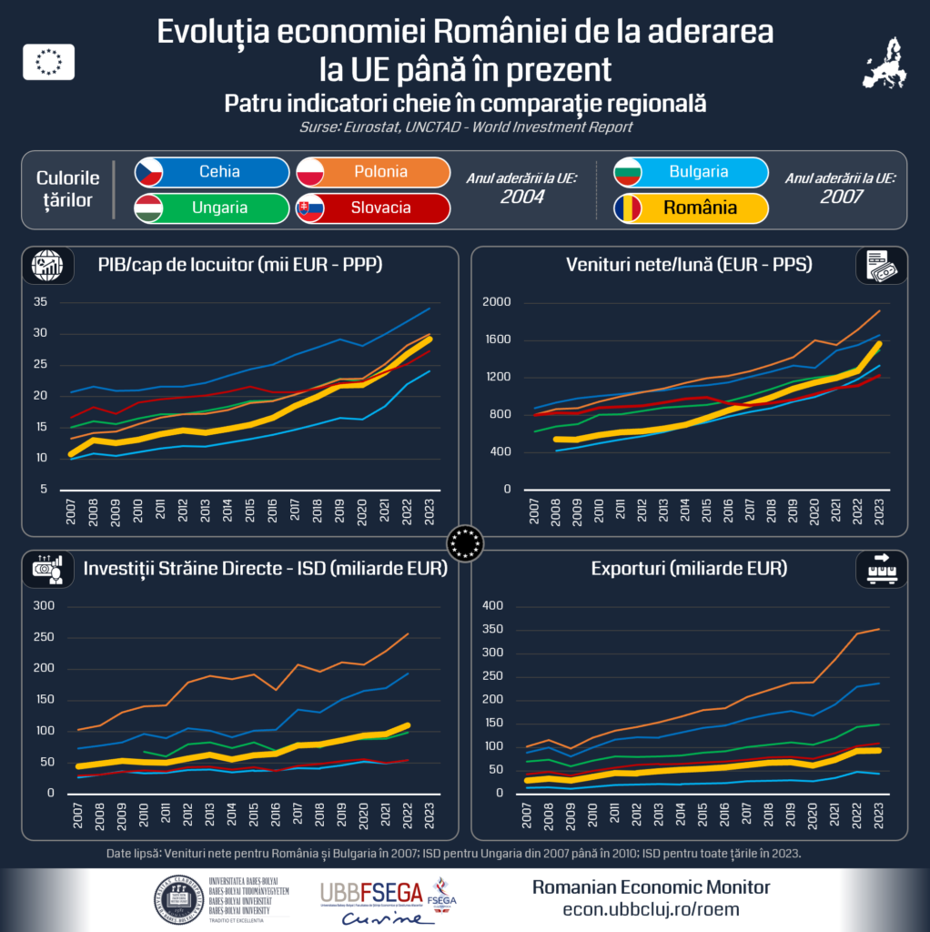 De Ziua Europei echipa RoEM a realizat o radiografie generală a evoluției celor mai importanți indicatori economici de la aderarea României la UE, comparând evoluția acestora cu alte cinci state membre din această regiune, considerate în general puncte de referință pentru economia României. Evoluția acestor indicatori prezintă un trend crescător puternic în cazul tuturor celor șase țări care au aderat în anul 2004, respectiv 2007 la UE, indicând astfel efectele economice per total benefice ale apartenenței țărilor din Europa de Est la comunitatea europeană.