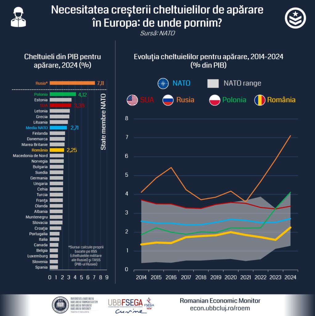 Conform estimărilor NATO, România a cheltuit 2,25% a PIB pe apărare în 2024, ceea ce era mai puțin decât media NATO (2,7%) sau ponderea cheltuielilor pe apărare a altor țări din regiune, precum Polonia (4,12%). În același timp, conform calculelor realizate de analiștii RoEM, Rusia a cheltuit aproximativ 7,11% a PIB pe forțele armate (calculele sunt bazate pe datele IISS – cheltuieli militare ruse de 145,9 miliarde de dolari, respectiv pe datele TASS – PIB-ul Rusiei fiind estimat la 2050 miliarde de dolari).